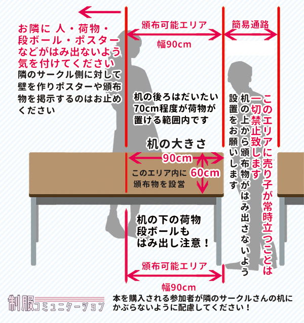 - 非常時には避難通路となるため、このスペースに頒布物、ポスター、荷物などのはみ出しは厳禁です。