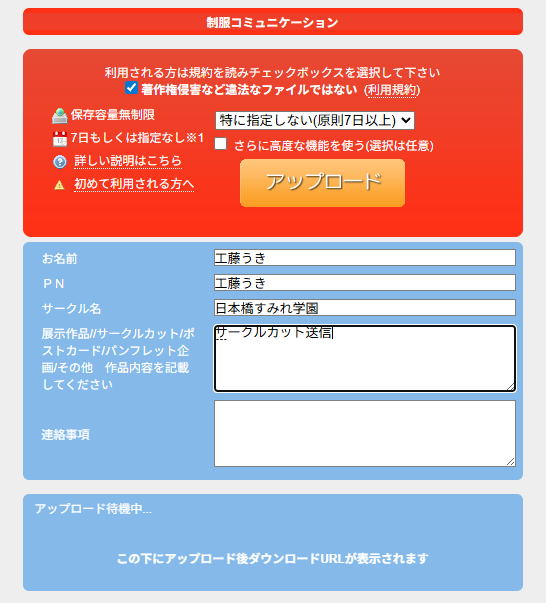 専用のフォームはございませんので、主催者宛のメールアドレスへ添付ファイルとして送るか、データ便などににアップロードしたデータのURLをメールやメールフォームでお知らせください。