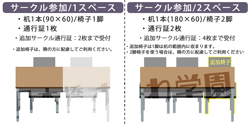 - 1スペース参加の場合、1本の机を2つのサークルで半分ずつ使用していただきます。お互いに気持ちよく過ごせるよう、マナーをお守りください。